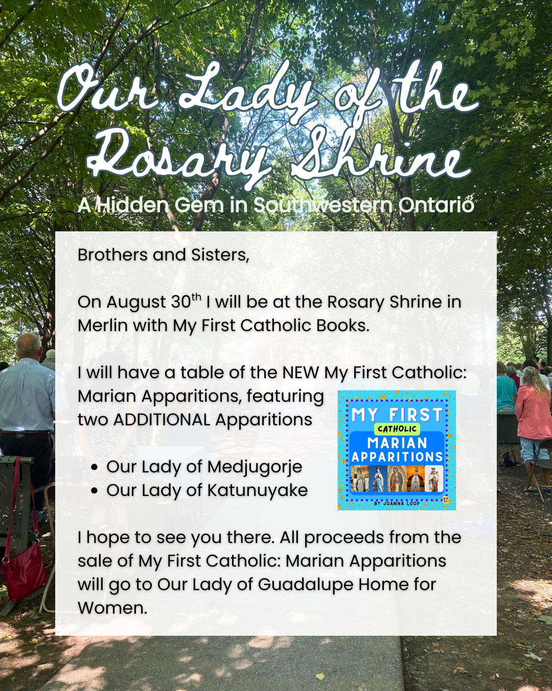 Brothers and Sisters,On August 30th I will be at the Rosary Shrine in Merlin with My First Catholic Books. I will have a table of the NEW My First Catholic: Marian Apparitions, featuring two ADDITIONAL Apparitions.- Our Lady of Medjugorje- Our Lady of Kat...